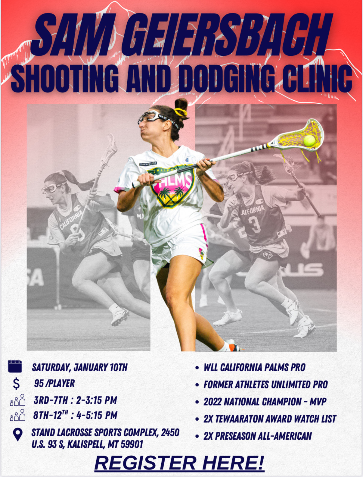 Join UNC star, NCAA D1 National Champion, former Athletes Unlimited player and current WLL California Palms player, Sam Geiresbach for a girls lacrosse clinic on Saturday, Jan 10th. Don't miss an incredible opportunity to learn from one of the best women's lacrosse players here IN Kalispell.